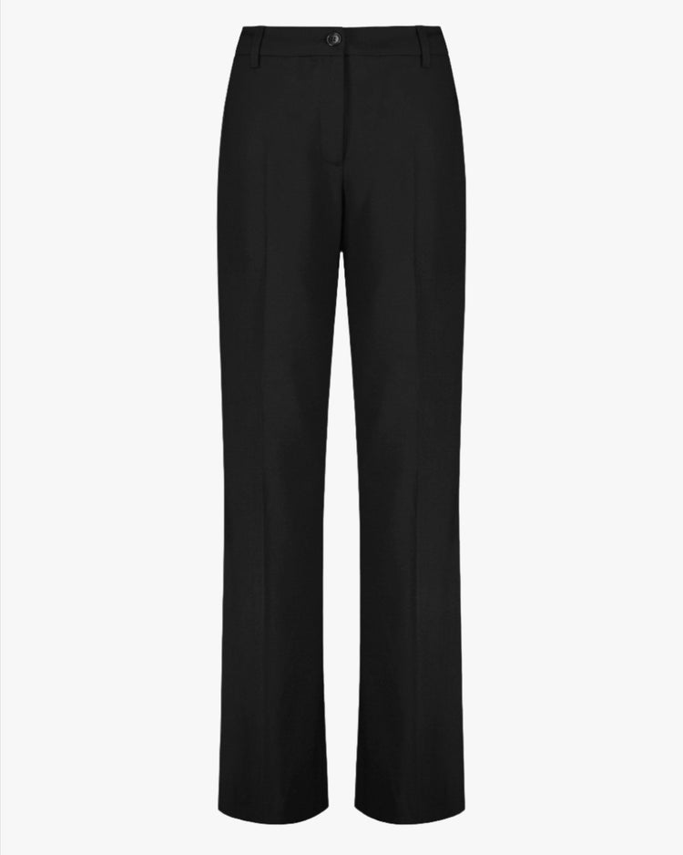 High waisted pant, cut from wool suiting. A wide straight leg silhouette, featuring a tailored waistband with button on waistband.