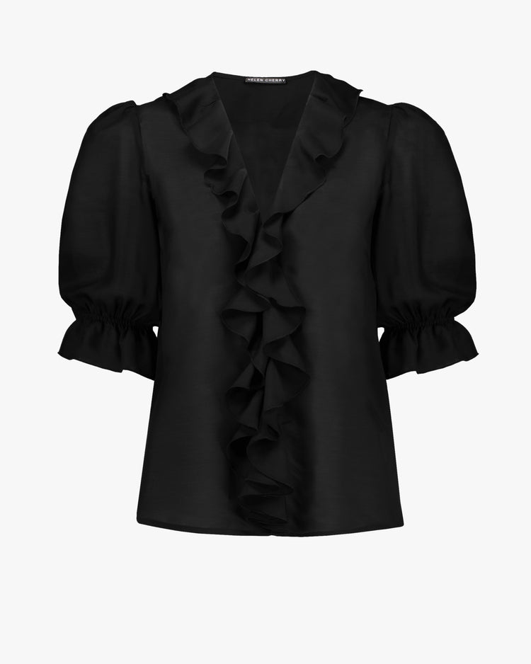 Relaxed fit, semi sheer blouse, cut from a cupro silk lawn. Featuring a ruffled collar, ruffles at center front, puff sleeves, shirred ruffle cuffs and split at front neck.
