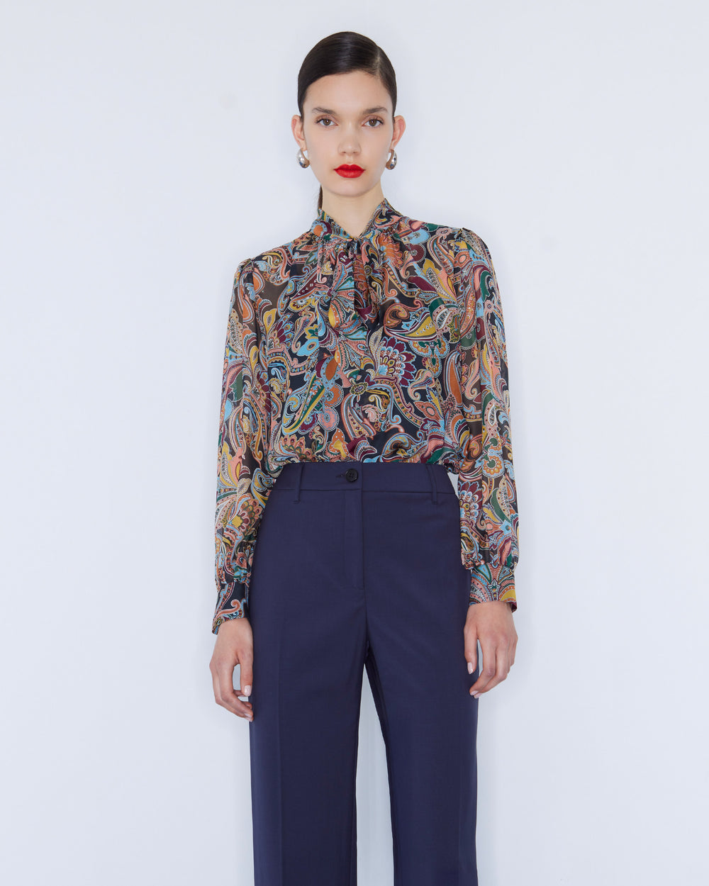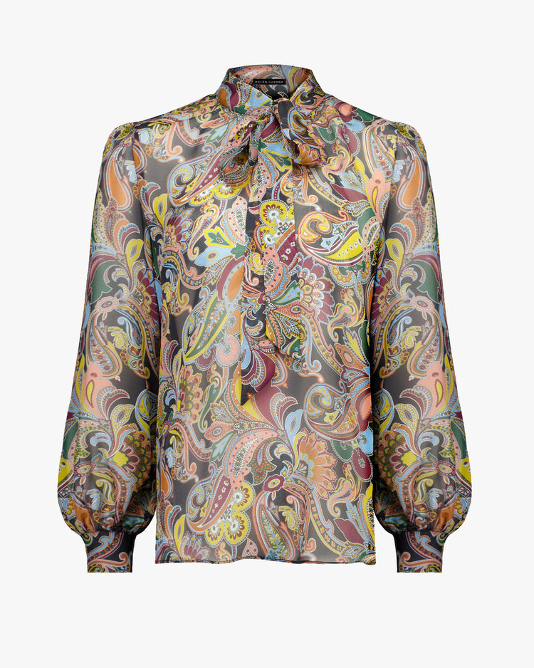 Relaxed fit blouse, cut from a printed paisley silk chiffon. Featuring a pussy bow tie at neck, voluminous sleeves and buttoned shirt cuffs. A statement piece for your wardrobe, pair with your favourite pair of Helen Cherry trousers.