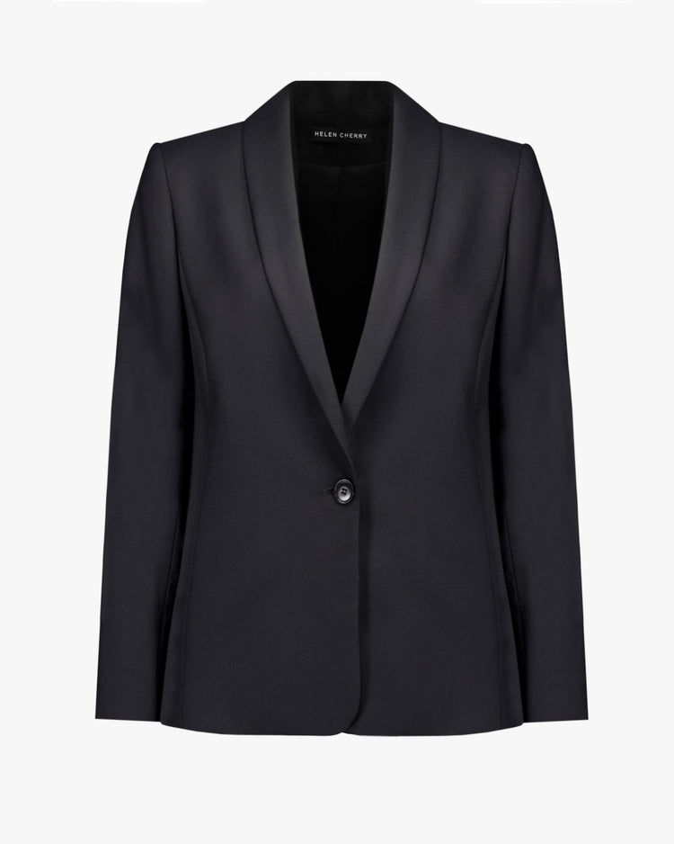 Classic fit tailored jacket, cut in a Wool Mix Serge suiting. Featuring a shawl collar, single button closure at waist, fully lined with contrast stripe lining in sleeves only. Pair with the matching Helen Cherry Flynn Pant.