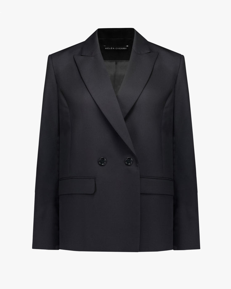 Relaxed fit jacket, cut from a wool mix serge. A tailored double breasted jacket, featuring peak lapels, flap pockets at front and finished with dark horn buttons. Pair with the matching Helen Cherry Classic Cigarette Pant or Flynn Pant.