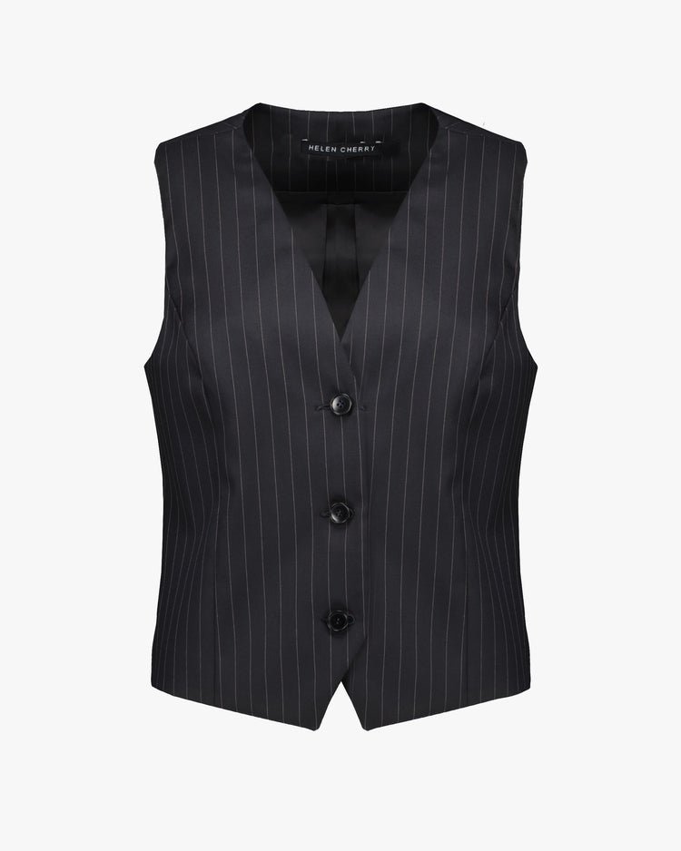 Classic fit waistcoat, cut from an wool pinstripe suiting. Featuring a V neckline, three button closure at front and pointed hem. Pair with the matching Helen Cherry Trouser Skirt - Pinstripe.
