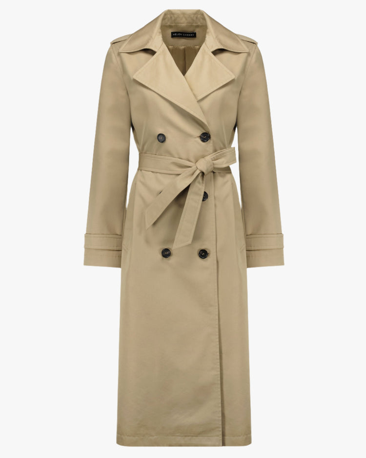 Relaxed fit trench coat, cut from a water repellant gabardine. Double breasted, featuring epaulettes at shoulder, generous notched collar and lapel, buttoned tabs at sleeve cuff, removeable self tie belt at waist, welt pockets at front and vent at center back hem.