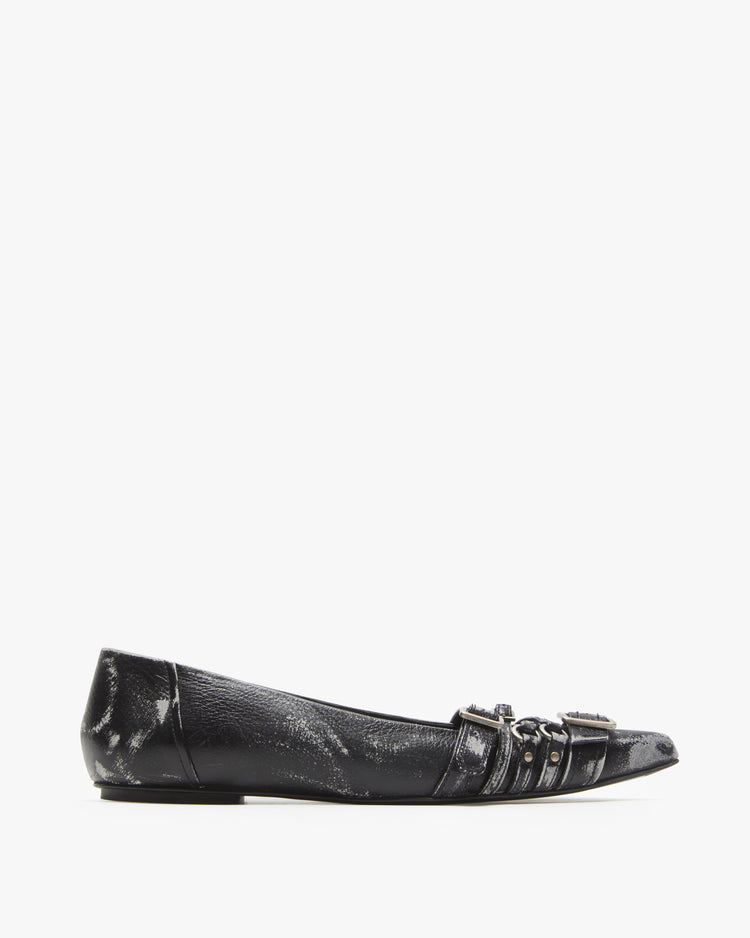 Ballet flats, crafted from 100% leather with a worked on finish. A slip on style, featuring a pointed toe and adorned with belt strap detailing across the front.