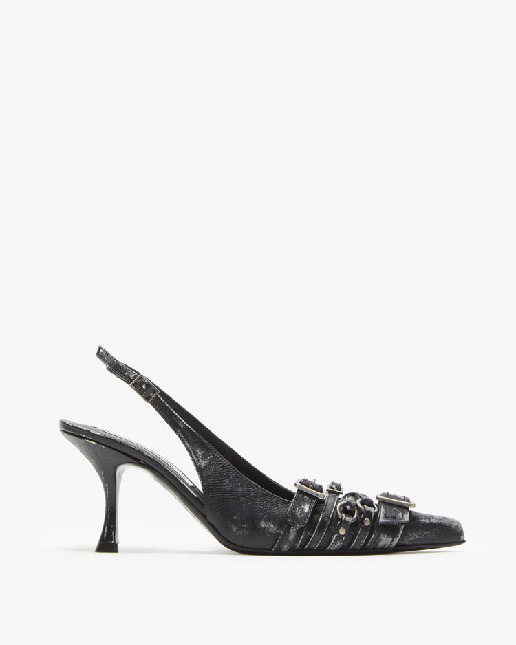 Slingback heel, crafted from 100% leather with a worked on finish. Featuring a pointed toe, and 85mm heel, and adjustable belt strap to wrap around the ankle. Adorned with belt detailing at the front.