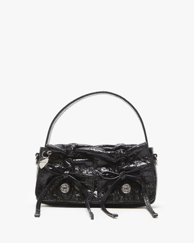 An Iconic new bag from Acne Studios, crafted from shiny patent leather. Featuring a multipocket construction, main compartment with magnetic flap closure, two side flap pockets, top handle, removable crossbody strap, metal Acne Studios buttons and heart charm on zip. Finished with laced knot detailing with leather bow.