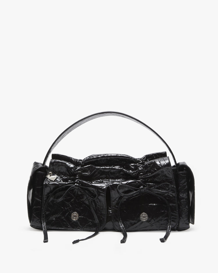 An Iconic new bag from Acne Studios, crafted from shiny patent leather. Featuring a multipocket construction, spacious main compartment with magnetic flap closure, two side flap pockets, top handle, jean inspired rivets, metal Acne Studios buttons and heart charm on zip. Finished with laced knot detailing with leather bow.