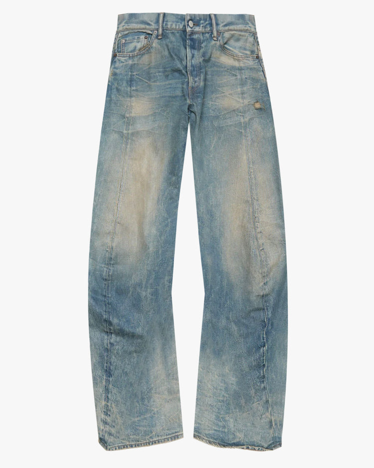 Loose fit jeans, cut from a organic cotton denim with a unique 'goldmine' wash. Low rise, featuring an ultra long length, wide engineered leg, 5-pocket construction, button fly, belt loops, curved side seam, and distressed detailing. Washed with irregular bleach and dirt marks for an authentically worn in look.