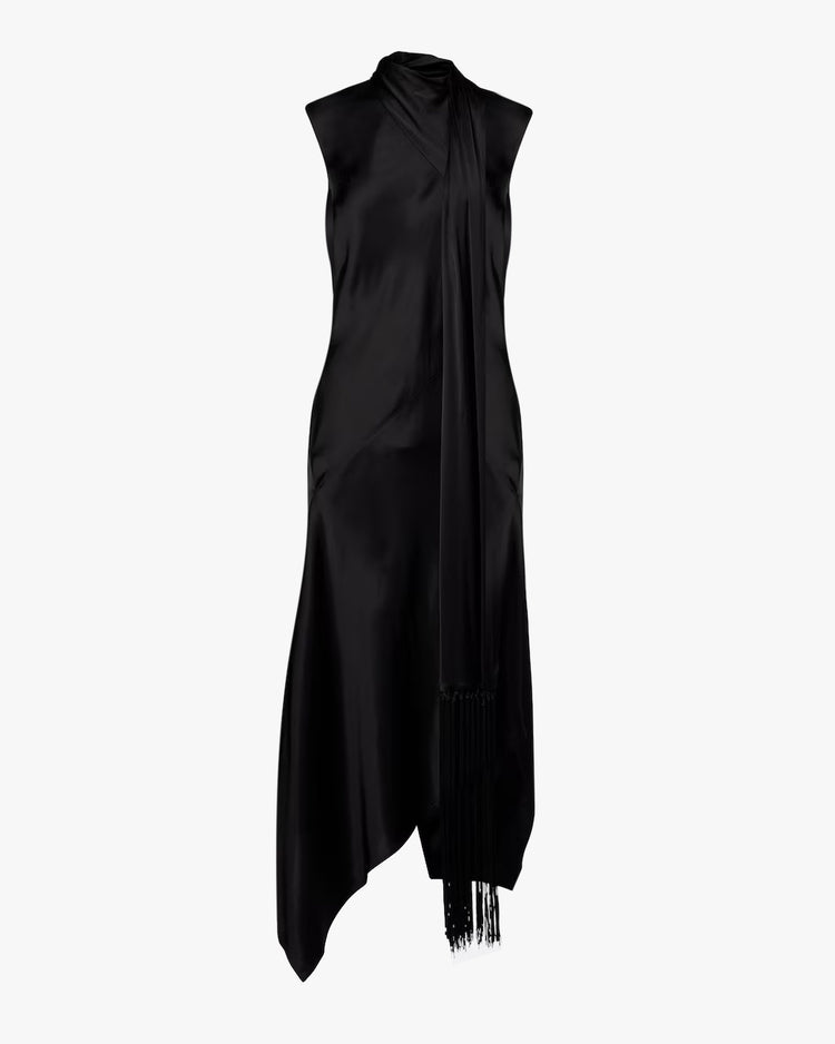 Relaxed fit dress, cut from a lightweight satin. A draped, sleeveless silhouette, featuring an attached, scarf with fringed edges designed to wrap around the neck, high neckline, asymmetrical hem, and mid-calf length.