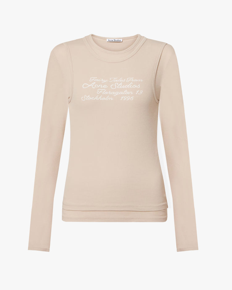 Slim fit layered long sleeve t-shirt, cut from an organic cotton elastane blend. Double layered construction, featuring a tank over a long sleeve t-shirt, a crew neckline, hip length and seasonal Acne Studios fairytale artwork on front.