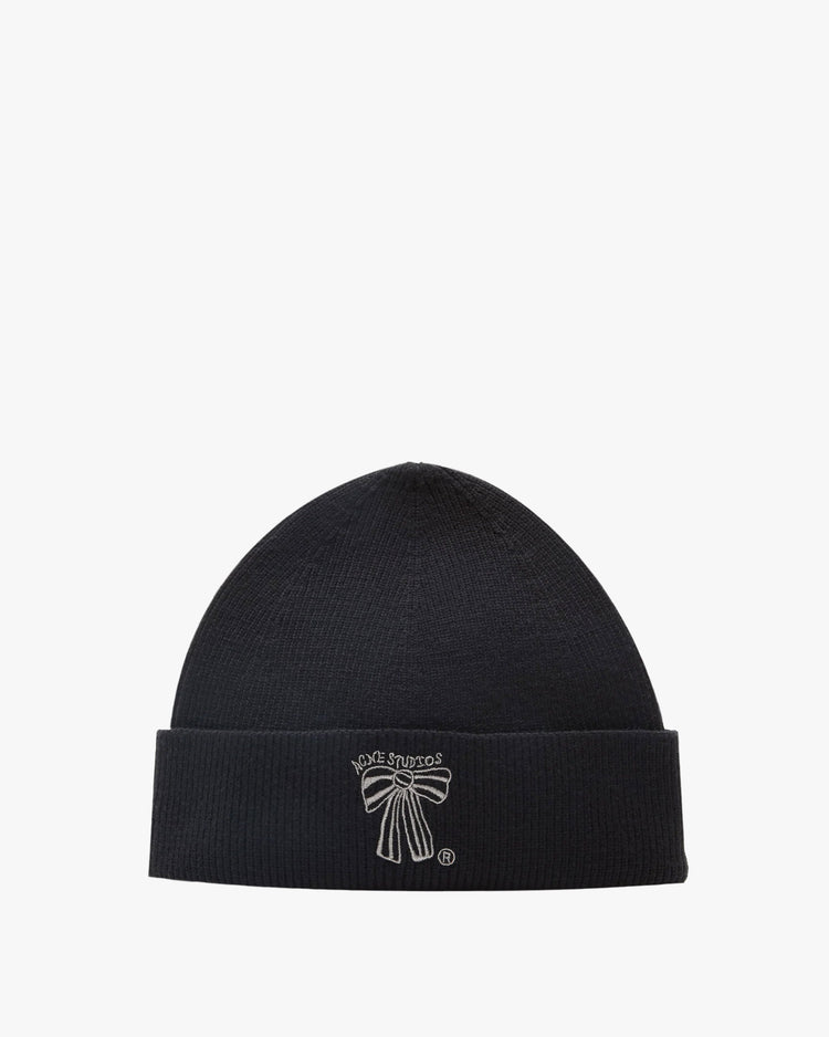 Chunky beanie, knitted from a thick ribbed merino wool. Featuring a wide up-turned edge with embroidered Acne Studios bow logo patch.