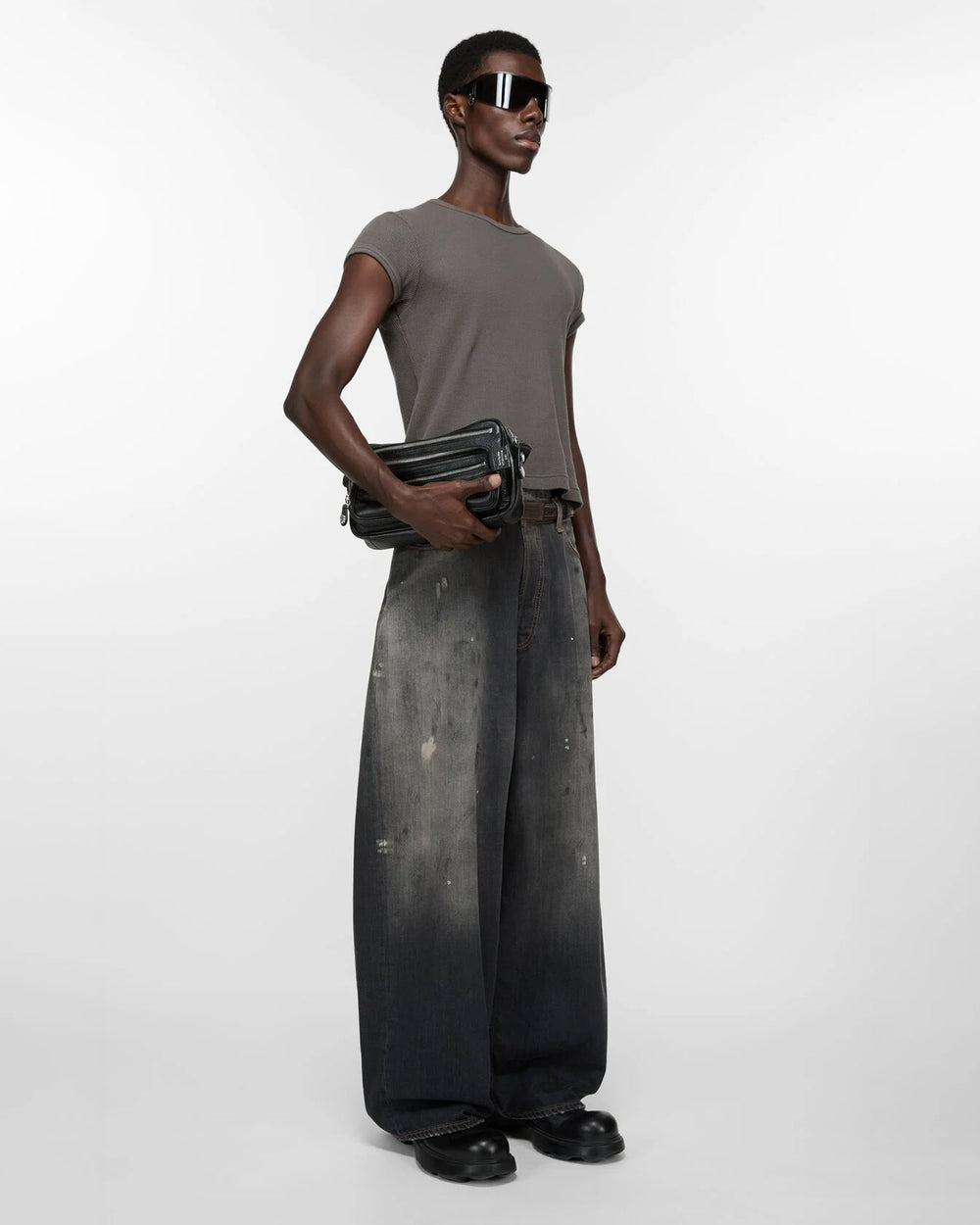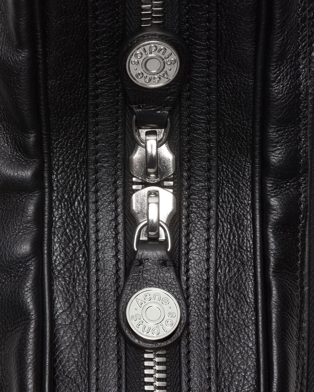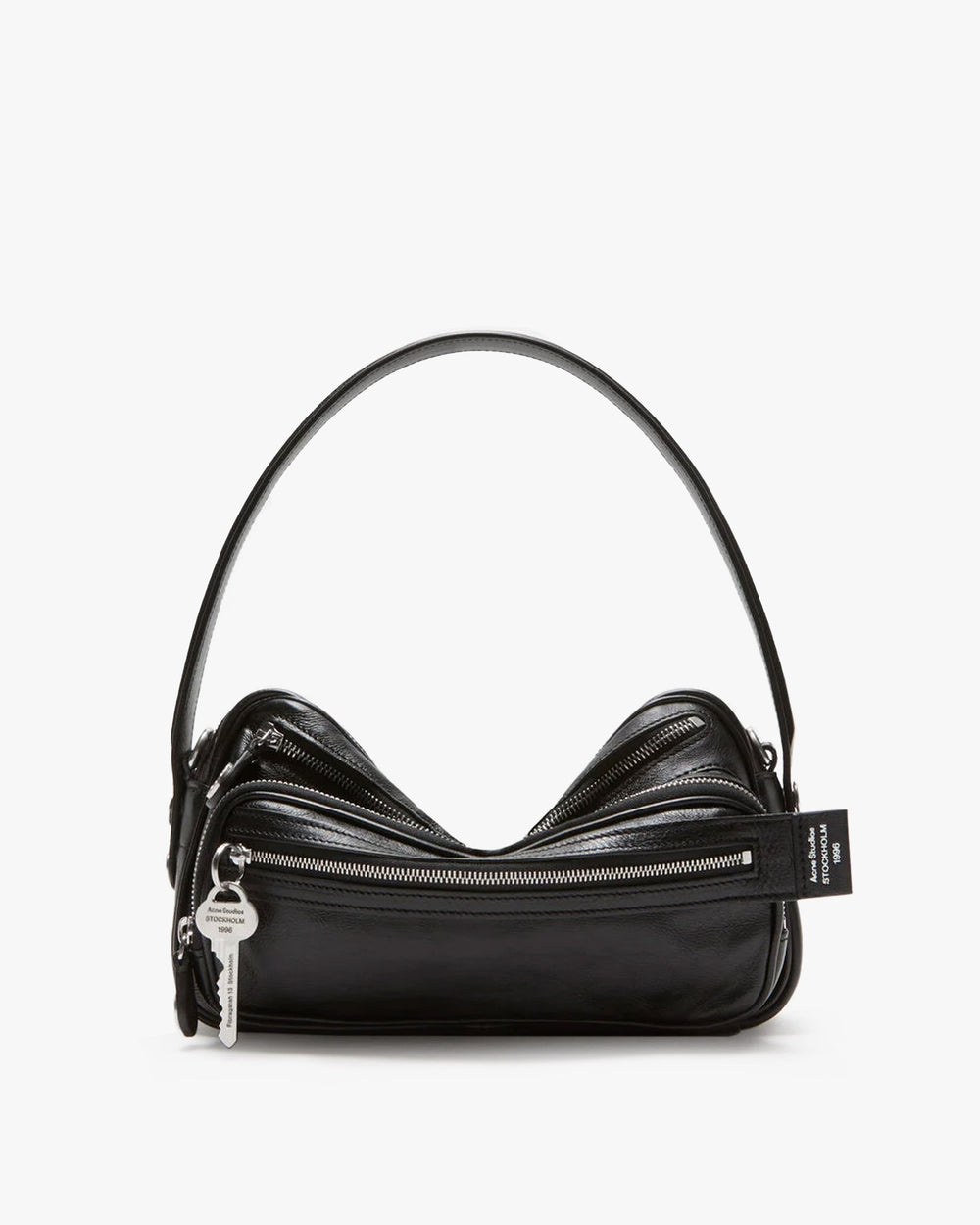 Camero Party bag crafted from soft leather with a multi-pocket design, zip compartments, a branded key charm, signature denim-style button logo, and the 1996 Acne Studios logo embossed in silver. Completed with silver metal hardware, a drop handle, and an adjustable crossbody strap.