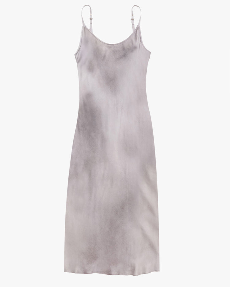 Classic fit slip dress, cut from a printed fluid satin. Bias cut, featuring spaghetti straps embellished with adjustable buckles, midi length and an all over printed effect.