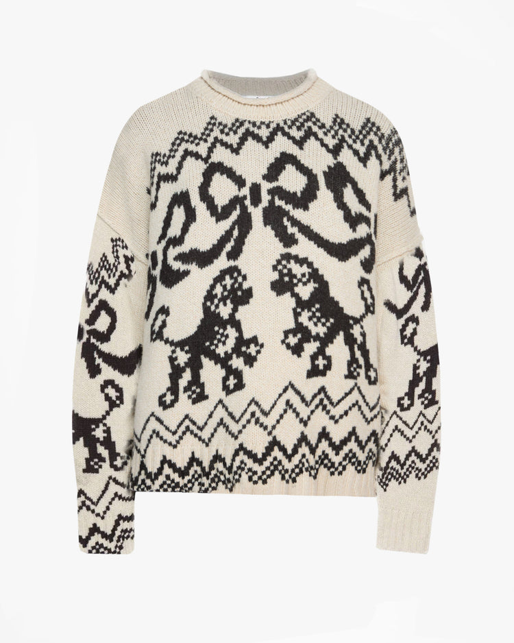 Relaxed fit sweater, knitted from a rich wool blend. Featuring a raised neckline with rolled edges, dropped shoulders, ribbed cuffs and hem, and seasonal Acne Studios all-over poodle animation print across the jumper.