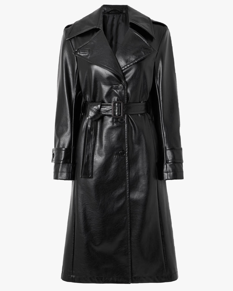 Relaxed fit trench coat, cut from faux leather. single breasted, featuring a generous collar and lapel, epaulettes at shoulder, oversized back flap yoke and self tie belt at waist.
