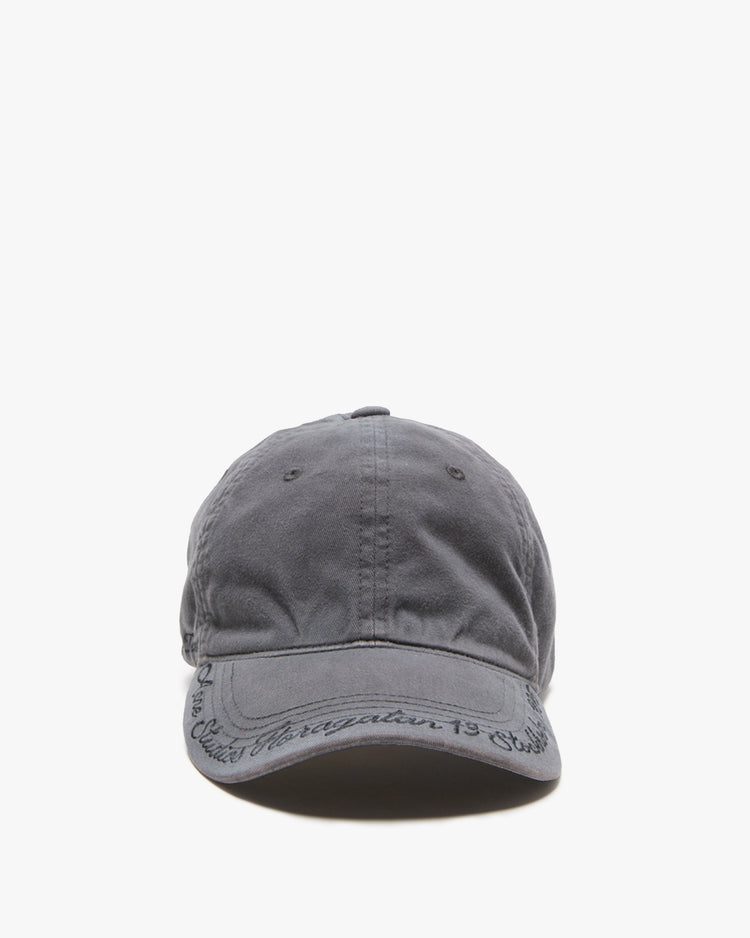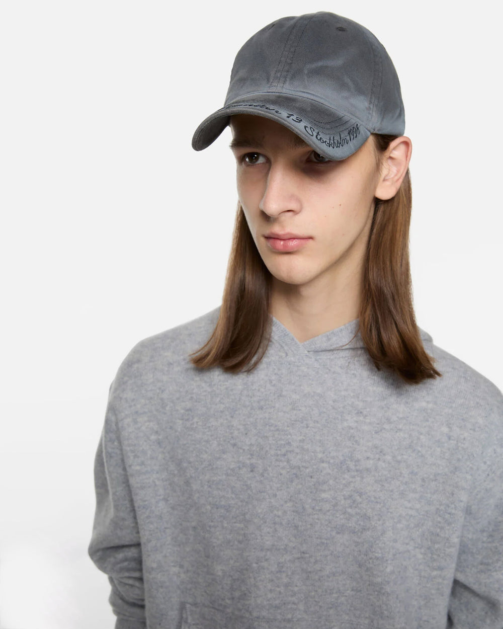 Six-panel baseball cap crafted from peached cotton twill with contrast topstitching. Features an embroidered Acne Studios 1996 logo on the brim and an adjustable D-ring closure for a custom fit.