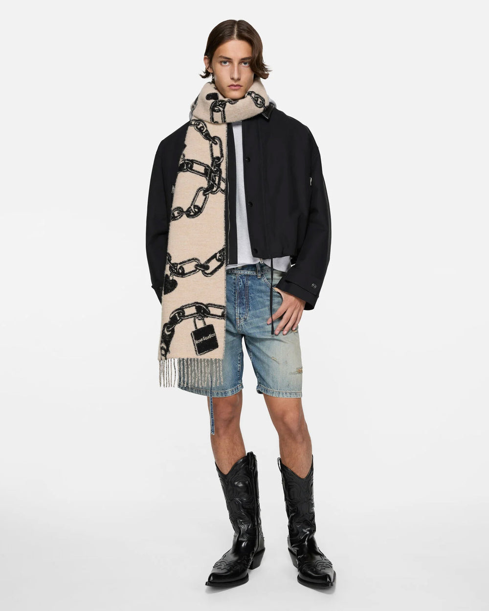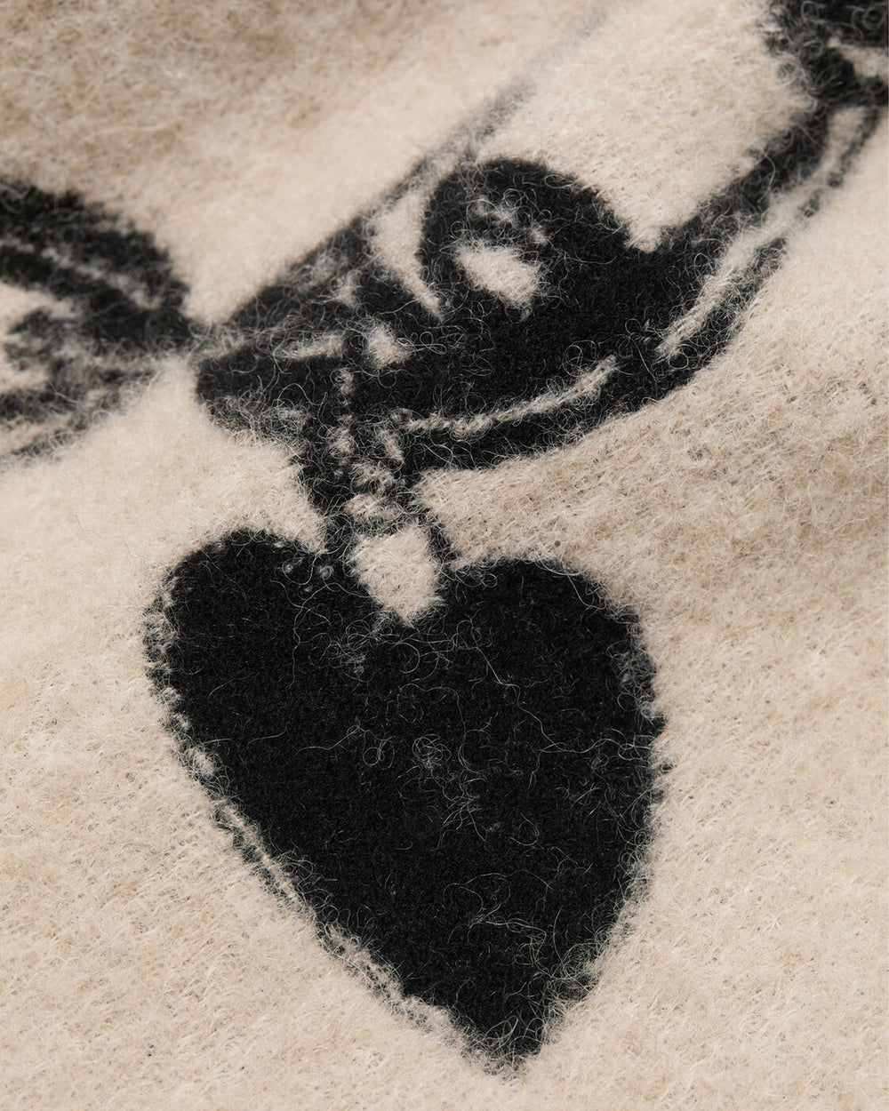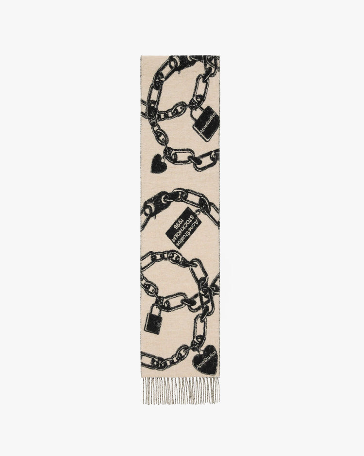 Blanket scarf crafted from an alpaca wool blend with a rich, warm hand feel. Features seasonal chain and padlock artwork woven in soft jacquard, finished with fringed ends. Double sided, colourway inverted on the reverse.