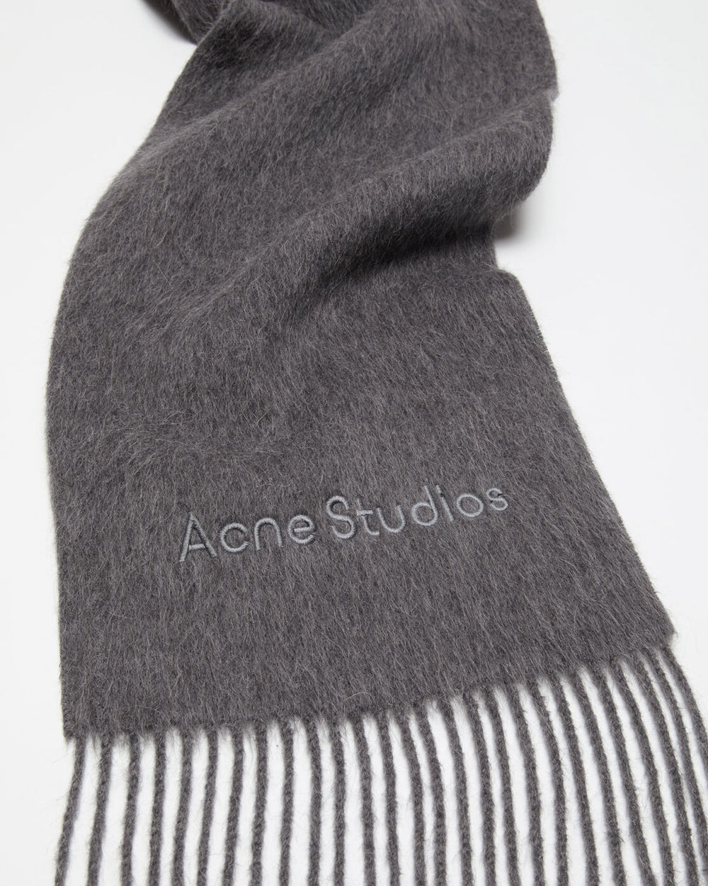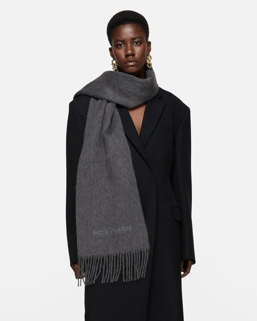 Blanket scarf crafted from an alpaca wool blend with a very soft hand-feel. Features logo embroidery and fringed ends. An elegant, chic and warm everyday scarf.