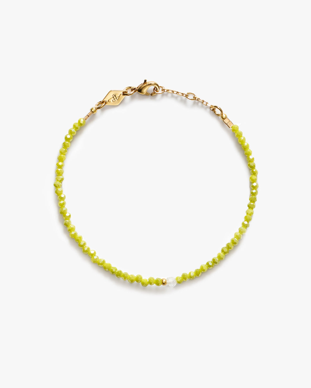 Delicate handcrafted bracelet, crafted from 18k gold-plated brass. Detailed in a row of rich earthy green glass beads and a crystal. Layer with other Anni Lu bracelets or wear on it's own.