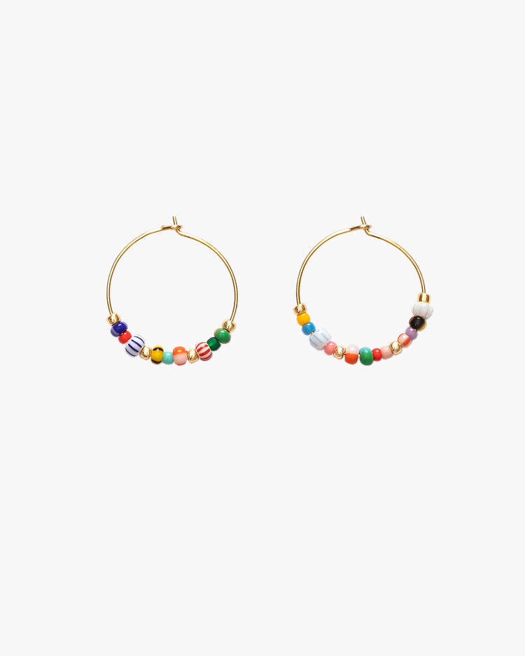 Delicate handmade hoop earrings, detailed in hand painted African glass beads and 18kt gold plated seed beads.
