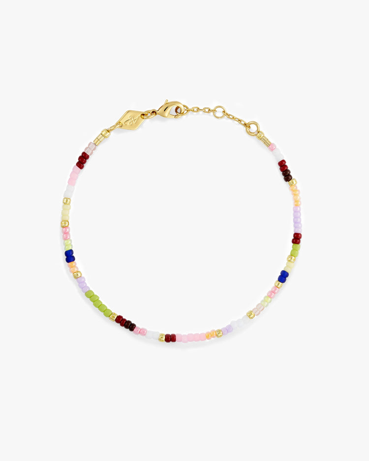 A delicate bracelet, crafted from 18k gold plated brass. Featuring vibrant glass beads, jade and petite freshwater pearls. A burst of colour and elegance.