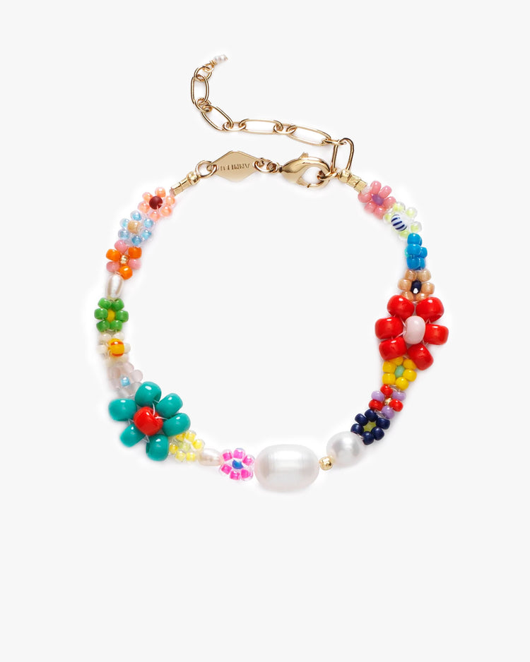 Colourful handmade bracelet, crafted in 18kt gold plated brass and detailed with glass beads and cultured freshwater pearls. The flowers are carefully handcrafted using the old and traditional Mexican Huichol technique, with the flowers being a signature for their incredible craftsmanship.