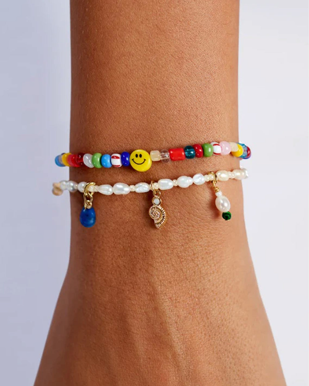 Bring a playful energy to your daily stack with this vibrant Anni Lu beaded bracelet. Hand-strung with an eclectic mix of multicoloured glass, porcelain and resin beads, this piece features a whimsical smiley face charm and a delicate floral detail. Crafted with 18kt gold-plated hardware, it’s a joyful statement designed for sun-drenched days and an effortless, bohemian spirit.