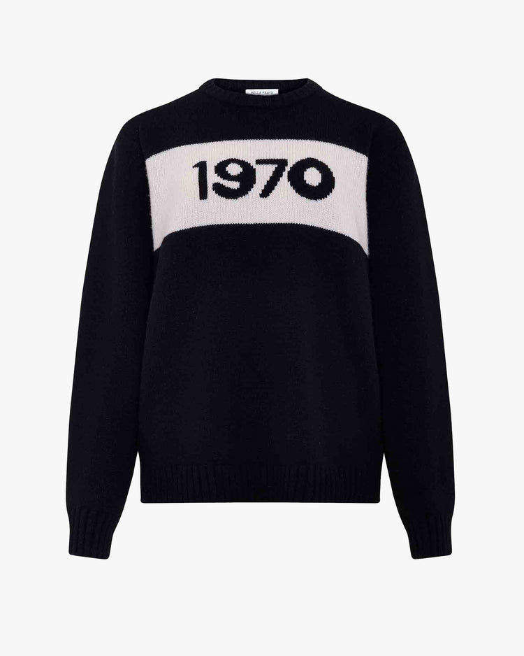 Oversized fit jumper, knitted from a chunky pure merino yarn. Featuring a ribbed crew neckline, long sleeves, and ribbed cuffs and hem. Emblazoned with iconic 1970 intarsia on front.