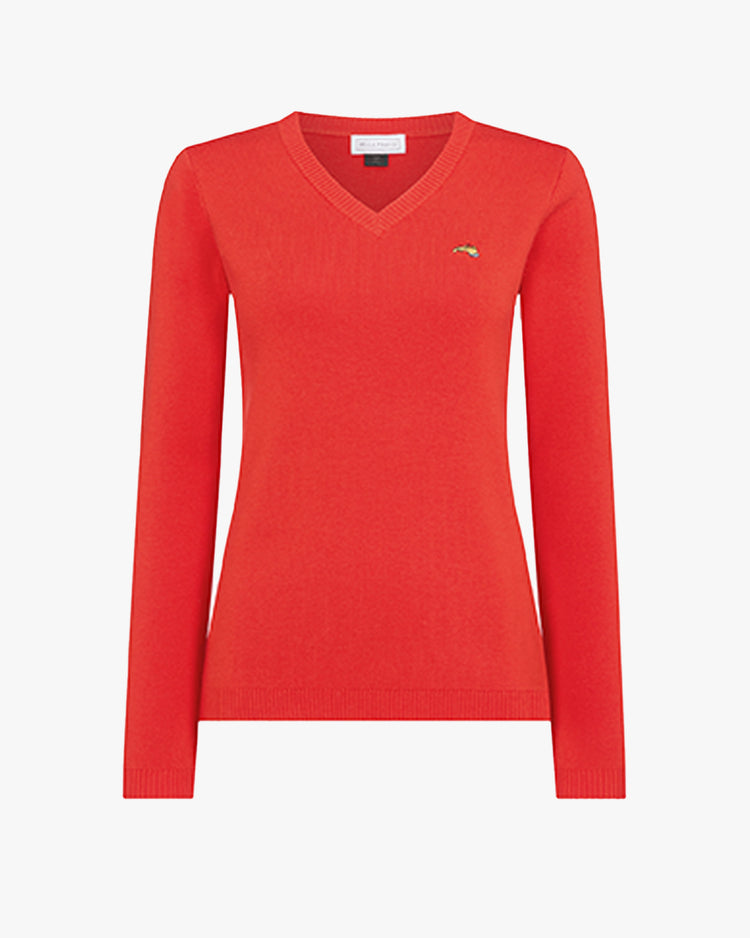 Slim fit jumper, knitted from a chunky pure merino wool. A boxy silhouette, featuring a ribbed V-neckline, long sleeves, and ribbed cuffs and hem. finished with the Iconic Bella Freud dog embroidered on front chest.