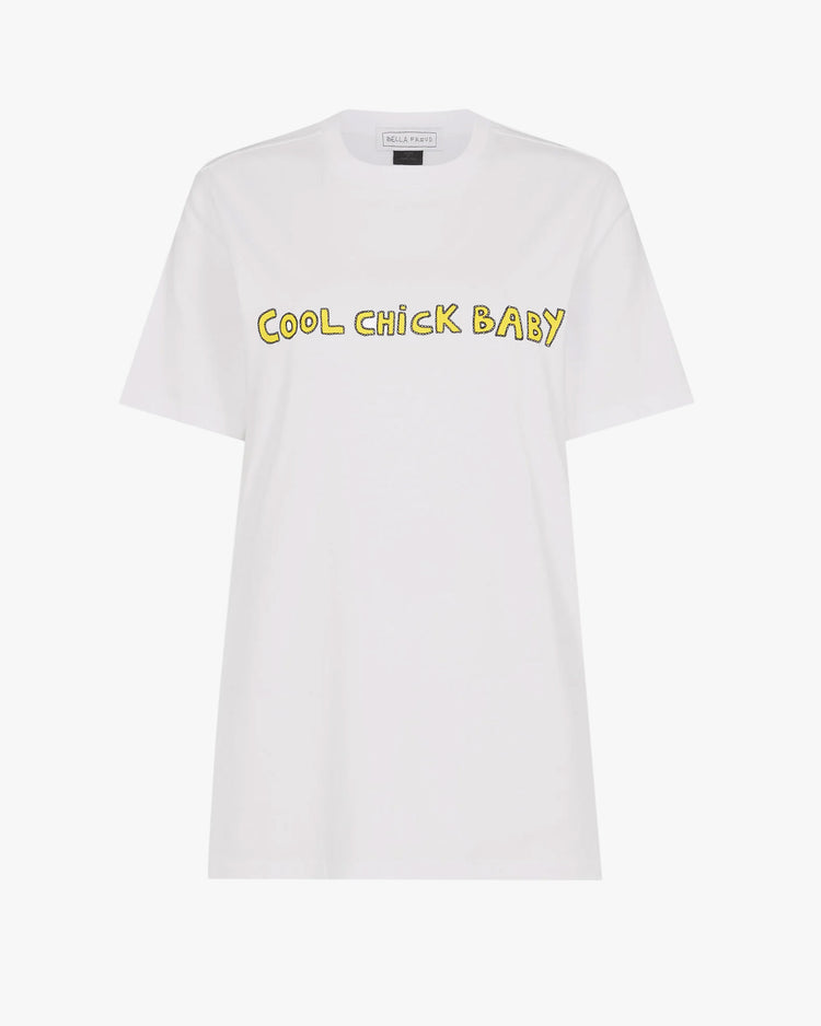 Relaxed fit t-shirt, cut from a an Organic Cotton jersey. Boyfriend style, featuring a ribbed crew neckline, short sleeves and large 'cool chick baby' print on front.