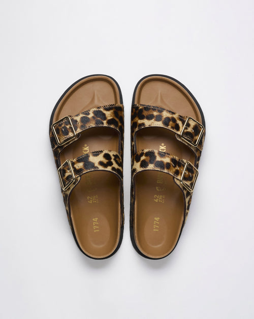 Rendered for the premium 1774 line. The Iconic Arizona 2-strap silhouette, crafted from leather with bold, luxurious, leopard print pony-like fur, amplifying its classic silhouette. Featuring large rounded metal buckles with logo, and signature cork-latex anatomical footbed, lined in nappa leather.