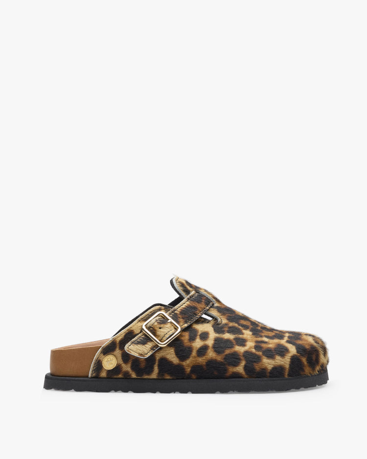 Rendered for the premium 1774 line. The iconic Boston silhouette, crafted from a leopard print pony-like fur. Slip-on style, featuring a rounded closed toe, adjustable exclusive 1774 silver toned buckle, and signature Birkenstock 1774 anatomical footbed.