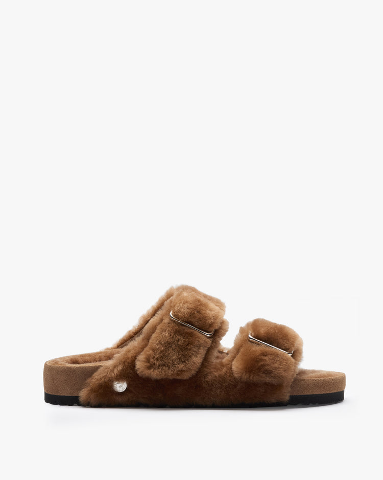 Rendered for the premium 1774 line. The Iconic Arizona 2-strap silhouette, crafted from leather with bold, luxurious, full shearling coverage inside and out, amplifying its classic silhouette. Featuring large rounded metal buckles with logo, and signature cork-latex anatomical footbed, lined in matching suede.