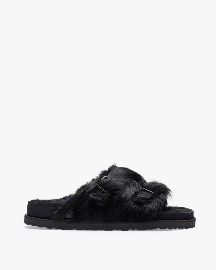 Introducing Zurich by Birkenstock 1774 to Workshop. A slip-on sandal, crafted from cozy Birkenstock 1774 shearling, pony-like fur and leather. Featuring a a wide strap, exclusive 1774 tonal buckles, and signature anatomical shaped footbed.