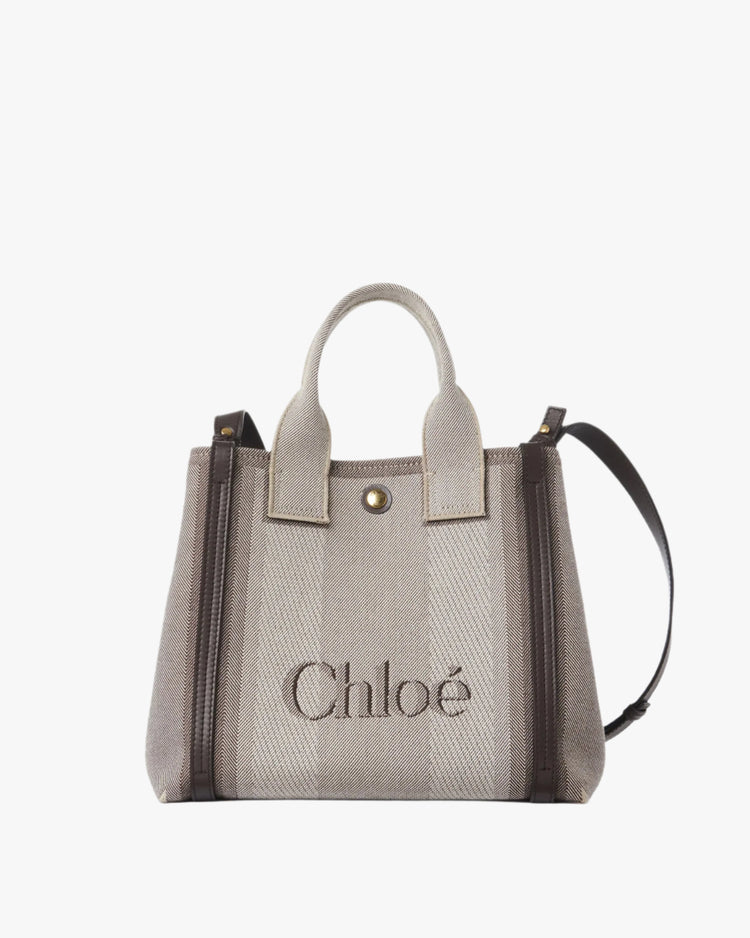 Small sized tote bag, crafted from a striped cotton canvas jacquard. complemented by contrasting vertical leather bands and an oversized Chloé logo. Featuring a detachable, adjustable crossbody strap, roomy main compartment and flat internal pocket.