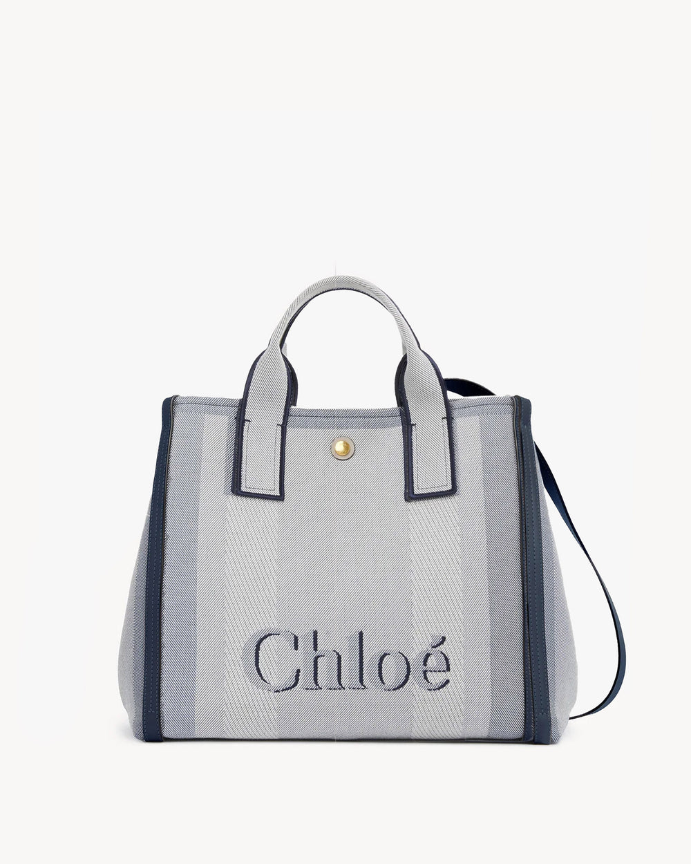 Small sized tote bag, crafted from a striped cotton canvas jacquard. complemented by contrasting vertical leather bands and an oversized Chloé logo. Featuring a detachable, adjustable crossbody strap, roomy main compartment and flat internal pocket.