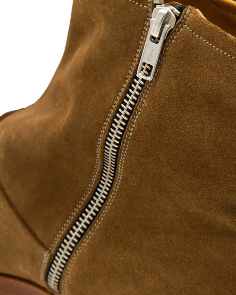 A classic ankle boot, crafted from an Italian suede leather in colour tan. Featuring a round toe, exposed metal zip, gold stamped style code at heel, a Common Projects signature.