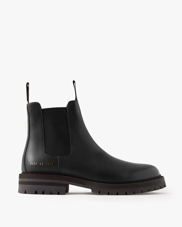 A classic chelsea boot silhouette, crafted from an Italian smooth leather. Featuring a round toe, elastic gussets, woven pull tabs at front and back ankle and gold stamped style code at heel.