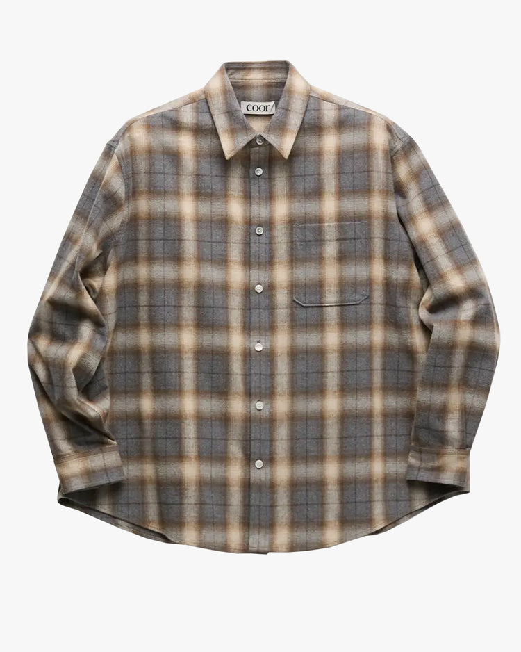 Made in Korea and cut from a flannel ombré check, the cotton shirt blends an oversized silhouette with a washed-lived-in feel. The wide fit shirt features a two piece collar, button down front, patch pocket at chest, buttoned shirt cuffs, pleat at back yoke and a classic shirt tail hem.