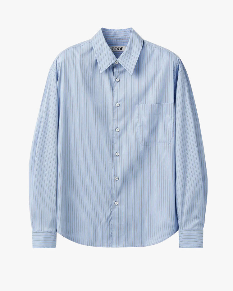 Oversized stripe shirt, cut from a striped cotton blend. A wide silhouette, featuring a two piece collar, button down front, patch pocket at chest, buttoned shirt cuffs, pleat at back yoke and a classic shirt tail hem.