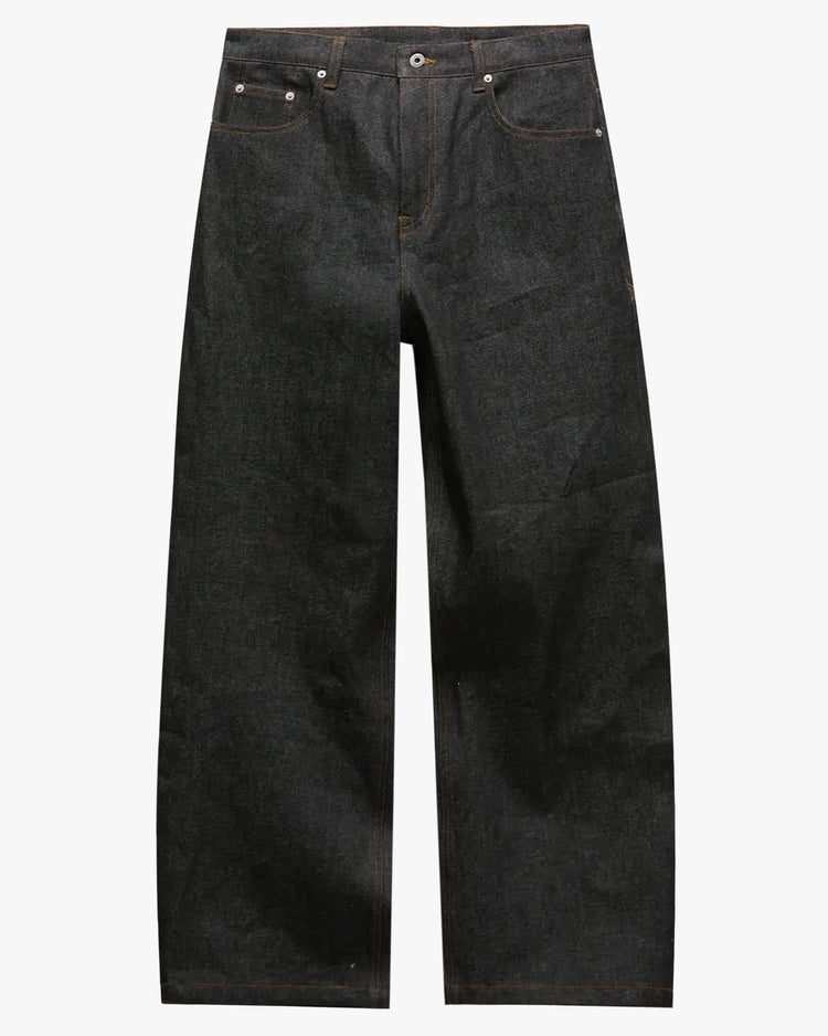 Made in Korea and cut from a rigid deep indigo cotton denim, the modern jean combines a wide leg silhouette with a mid rise. Classic 5 pocket details are finished with contrast stitching.