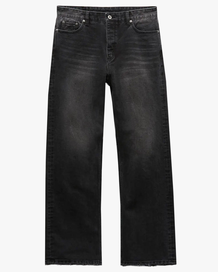 Made in Korea and cut from a washed black cotton denim, these straight leg jeans with a mid rise feature classic 5 pocket detailing with a canton button fly. A clean, straight cut offers versatility for your everyday.