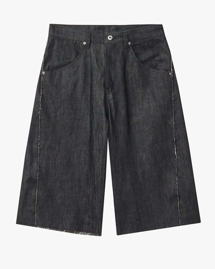 Relaxed fit Bermuda shorts, cut from 100% cotton denim. Mid rise, below knee length, featuring an ultra wide leg, belt loops, front pockets and a raw cut hem.