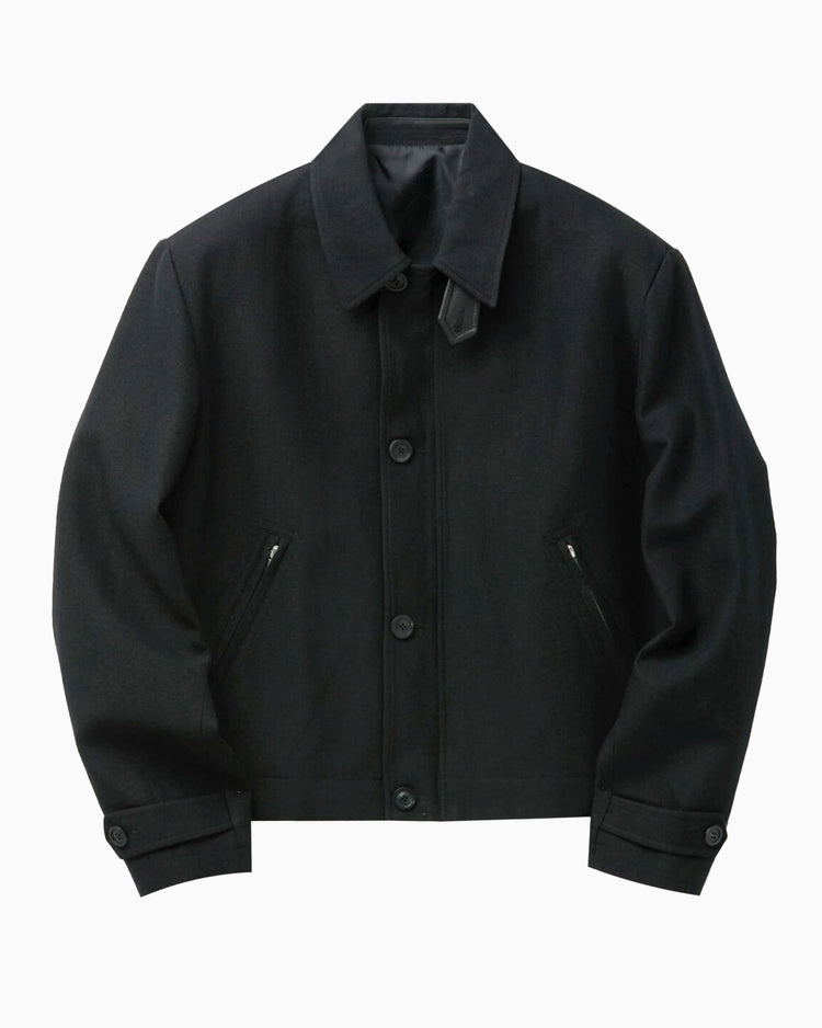 Classic fit jacket, cut from a wool linen blend. A boxy silhouette, featuring a two piece collar with a leather tab converting it to a standing collar, front button placket, two-way zip closure, zip pockets, adjustable tab details at sleeve and hem, and signature COOR details.