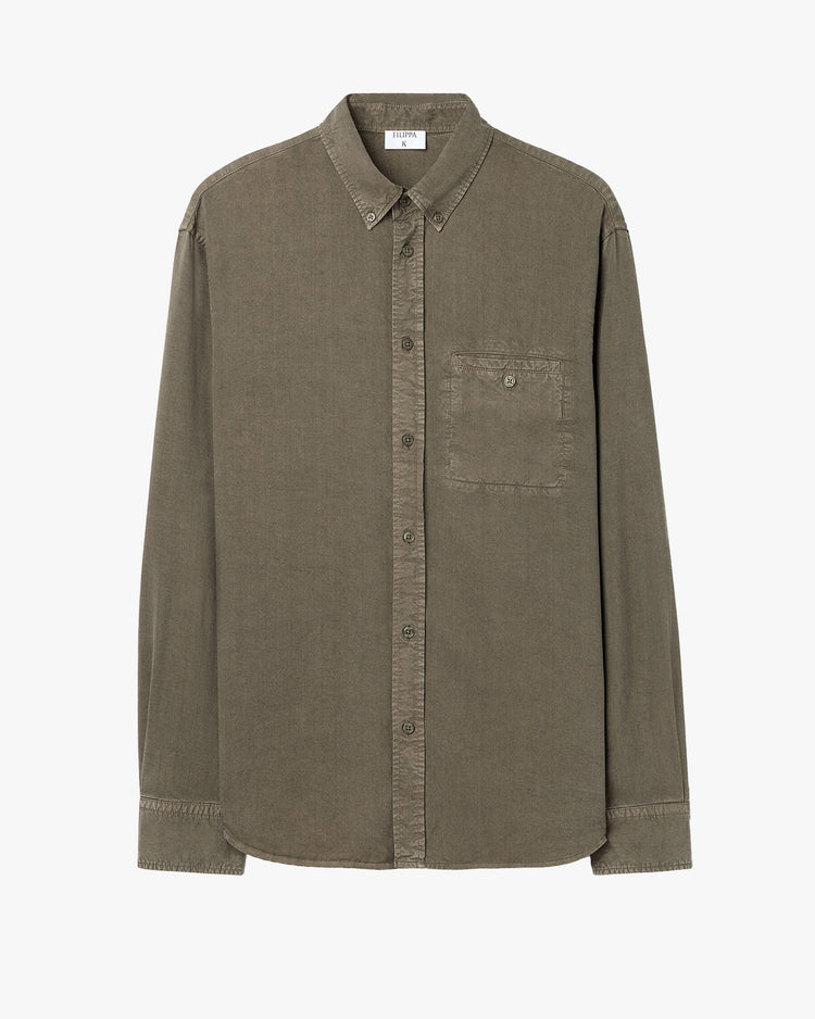 Relaxed fit shirt, cut from a lyocell shirting. Featuring a button-down two-piece collar, back yoke with hanger loop, buttoned shirt cuffs and buttoned welt pocket at chest.