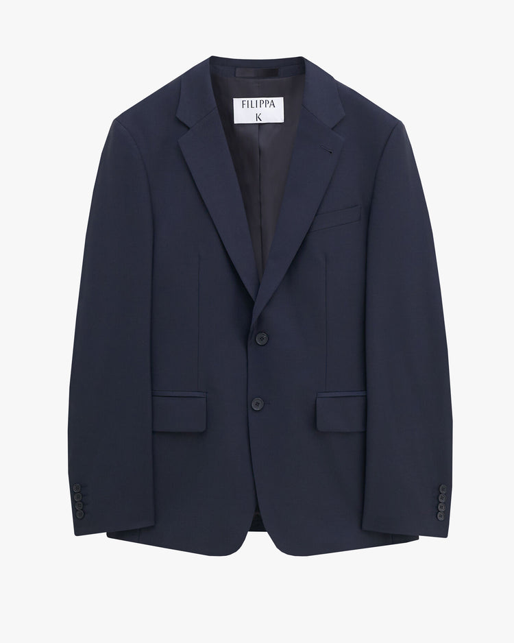 Slim fit tailored blazer, cut from a mid-weight wool-blend suiting. Single breasted, featuring structured shoulders, a notched collar and lapel, two button closure at front, welt pocket at chest, flap pockets at front, buttoned sleeve vents and vent at centre back hem. Pair with the matching Filippa K Man Slim Tapered Wool Trouser for a full suit look.