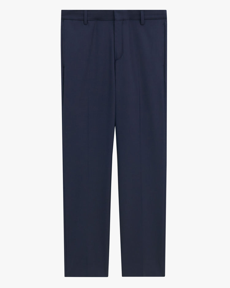 Slim fit tailored trouser, cut from a mid-weight wool blend suiting. Featuring a mid rise, full length tapered leg, tailored waistband with beltloops, zip fly, hook & eye closure, side slant pockets, back welt pocket, and pressed creases. Pair with the matching Slim fit wool blazer.