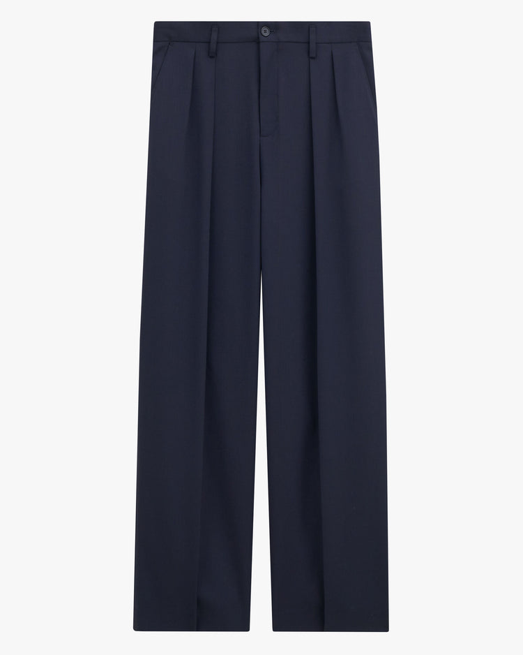 Relaxed fit tailored 'milo' trousers, cut from a mid-weight merino wool blend. Featuring a mid rise, full length wide leg, tailored waistband, beltloops, pressed pleats, faux horn button and zip closure vertical creases, slash pockets at the sides and welt pockets at rear.