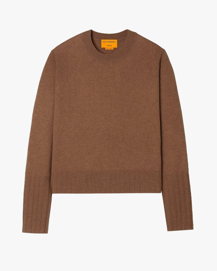 Slim fit sweater, knitted from 100% cashmere. Featuring a crew neckline, slight crop, long sleeves, exaggerated high ribbed cuffs, and ribbed neckline and hem.