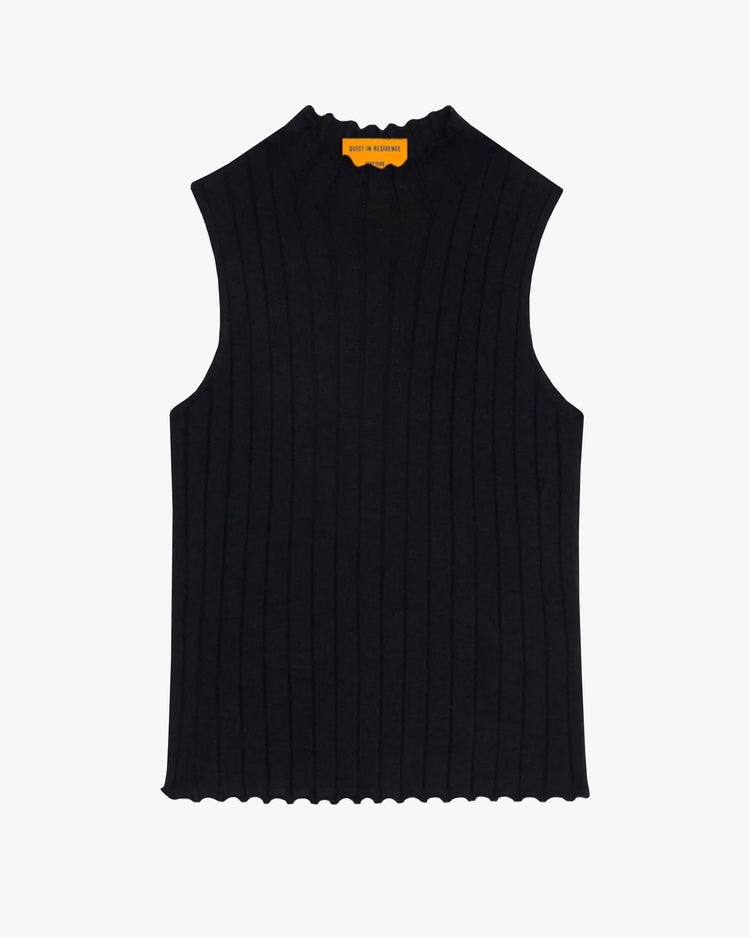 Slim fit top, knitted from a lightweight ribbed cashmere. A sleeveless style, featuring a mock neck, self hem and neck finish, all over rib and signature Guest In Residence branding at centre back.